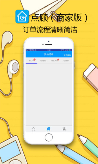 点顾商家版APP ,接单服务,操作简介,页面简洁,方便快捷,给商家带来全新的使用体验,拉近用户和商家的距离,点一点,照顾多一点!
