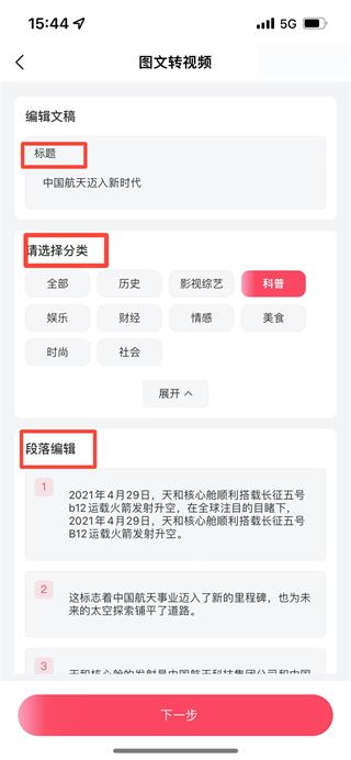 3、可以对文章进行分类、对标题以及段落进行编辑,编辑完成后,点击“下一步”