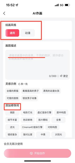 2、在“AI作画”页面中,选择“绘画风格”,并对画图进行描述;想要生成的图片和自己的想法更加贴合可以添加一些“修饰词”
