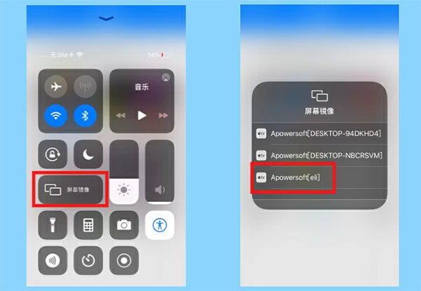 4、在你的手机上,底部上滑/右上角下滑弹出控制中心,点击“屏幕镜像”按钮,选择“Apowersoft你的电视设备名称”之后,手机就会成功投屏到电视上。