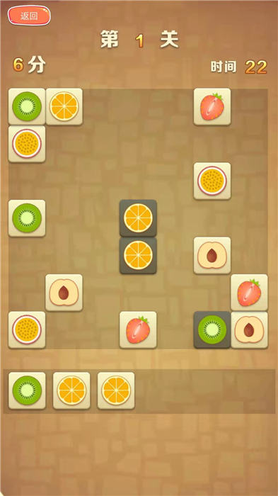 点击上面的水果,每点击一个,就会滑动到最下面的栏目,凑齐三个相同的水果之后,就会被消除,直到消除所有的水果之后,就能够通关了,下一关会比当前关卡,多出很多水果,有些关卡还会出现重叠水果,更多好的挑战等待降临。