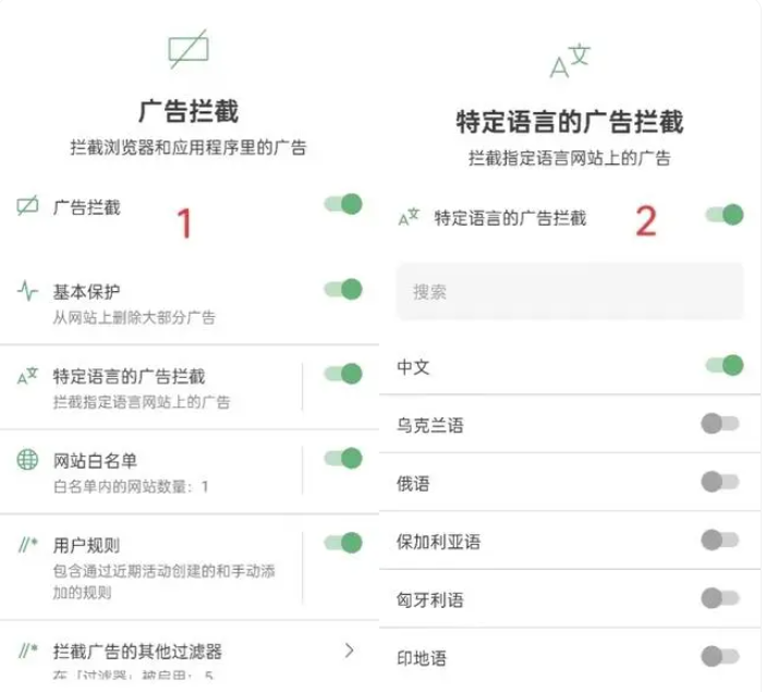 按钮前如果有一道竖线,就说明此功能存在二级设置菜单,你可以点广告拦截,自行进行设定。
