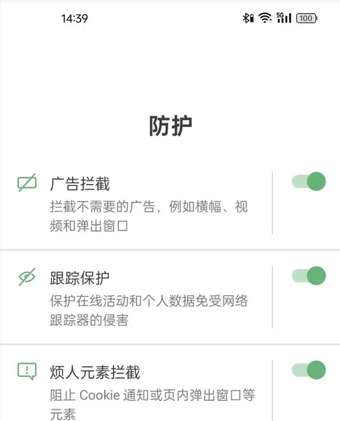 点击下方盾牌图标,今日app可以看到广告拦截、跟踪保护、烦人元素拦截、DNS保护功能、防火墙和浏览安全,你可以全部开启。