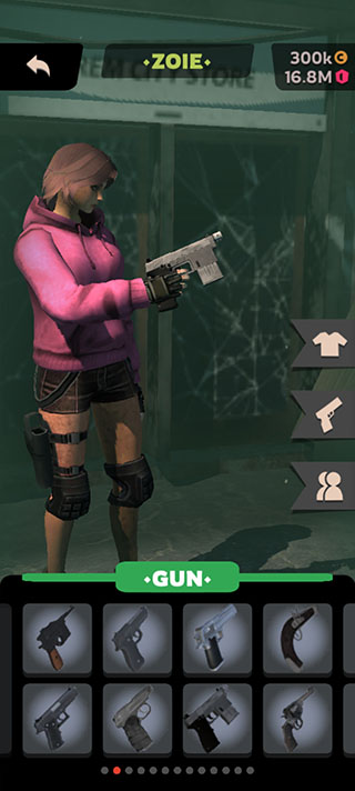 玩家点击首页store即可进入商店,可以切换人物以及衣服,也可以购买武器。