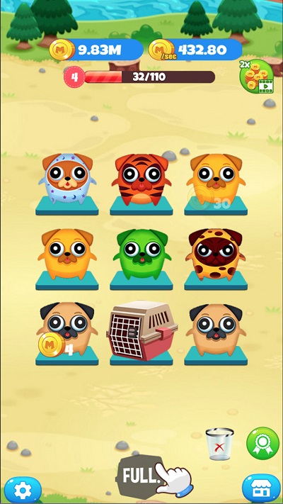 2、点击屏幕,将相同的两只小狗崽合并,就有可能解锁高级稀有品种。