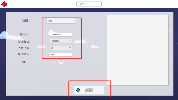 4、点击创建房间可以进行地图选择,房间名设置,游戏模式,人数,以及密码设置,方便与好友同游不被陌生人打扰,设置好之后点击创建即可,其他玩家可以根据相关信息进入房间。
