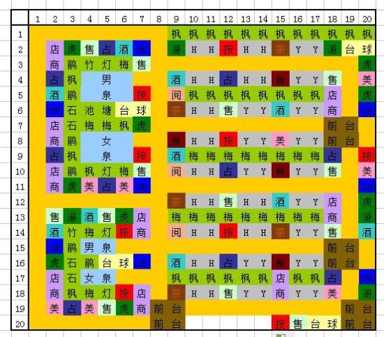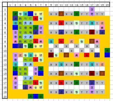 一周目的小温泉布局~空白的格子随便放,客房不够放客房,再随便放些商店也是可以的。(PS:图中 店商-小卖部 虎-游戏机 游-游艺机 鹃-映山红 酒-咖啡厅 OK-歌厅 售-自动贩卖机 )旧图有的翻译不同,不清楚的再问