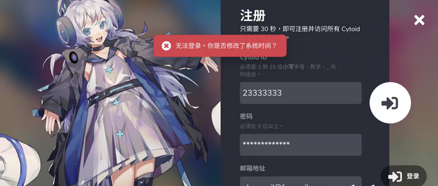 Cytoid账号注册出现任何错误都会提示是否修改系统时间。除非你的Pad/手机的时间确实不对,否则没必要调。