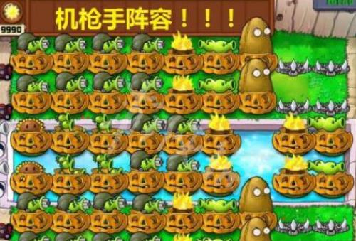 3、机枪手阵容,主要就是机关枪射手,外层加上火炬树桩进行保护,整体既有输出又有防御。