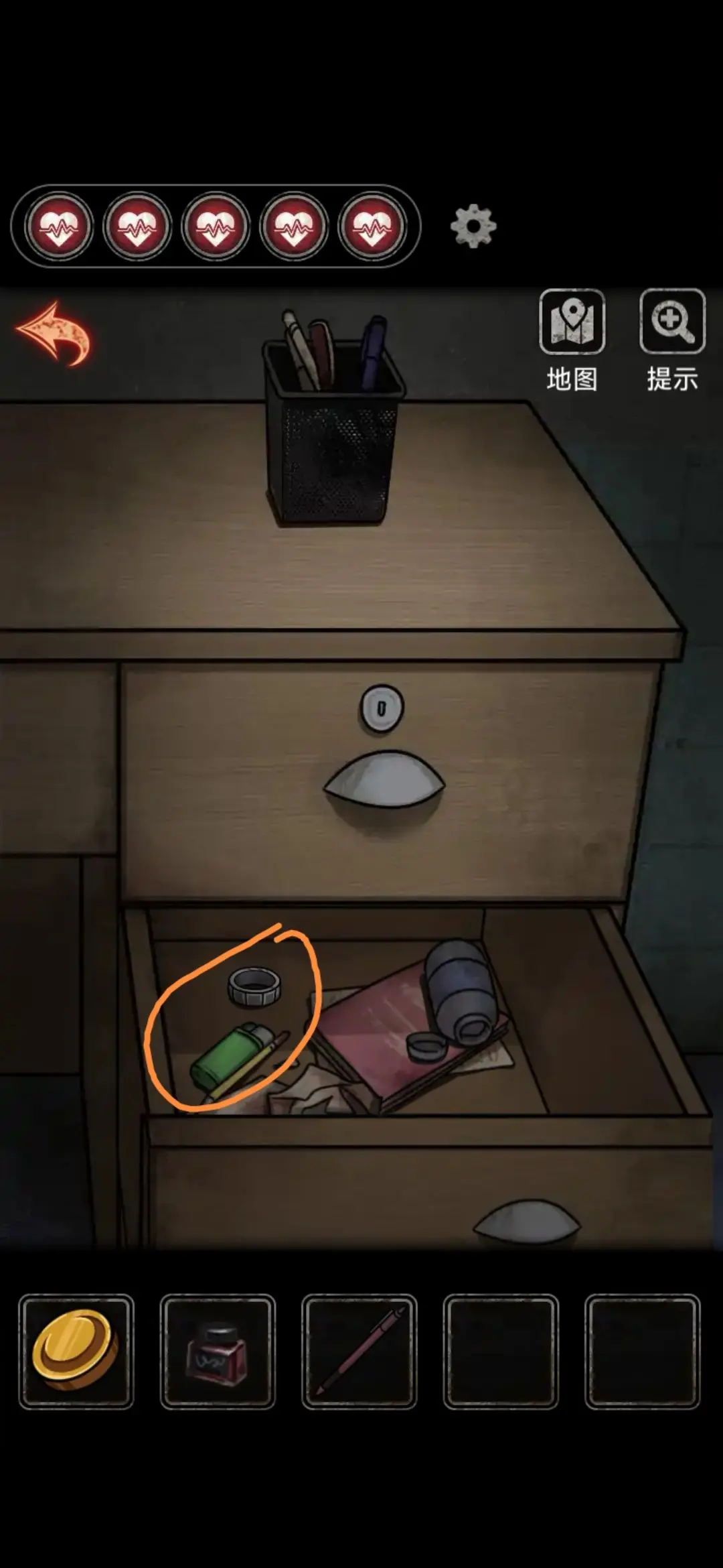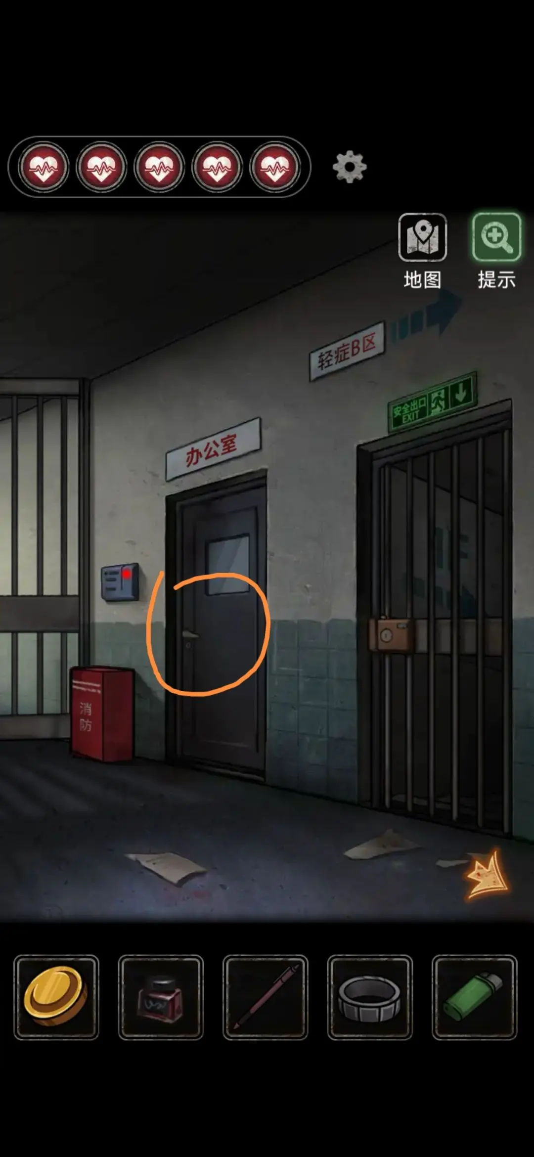 打开办公室门进入点击桌面得到红墨水,笔,从书桌柜得到打火机和小零件,从墙上得到2009号房间钥匙,打开资料柜点击得到资料信息,用钥匙打开2009号房间门