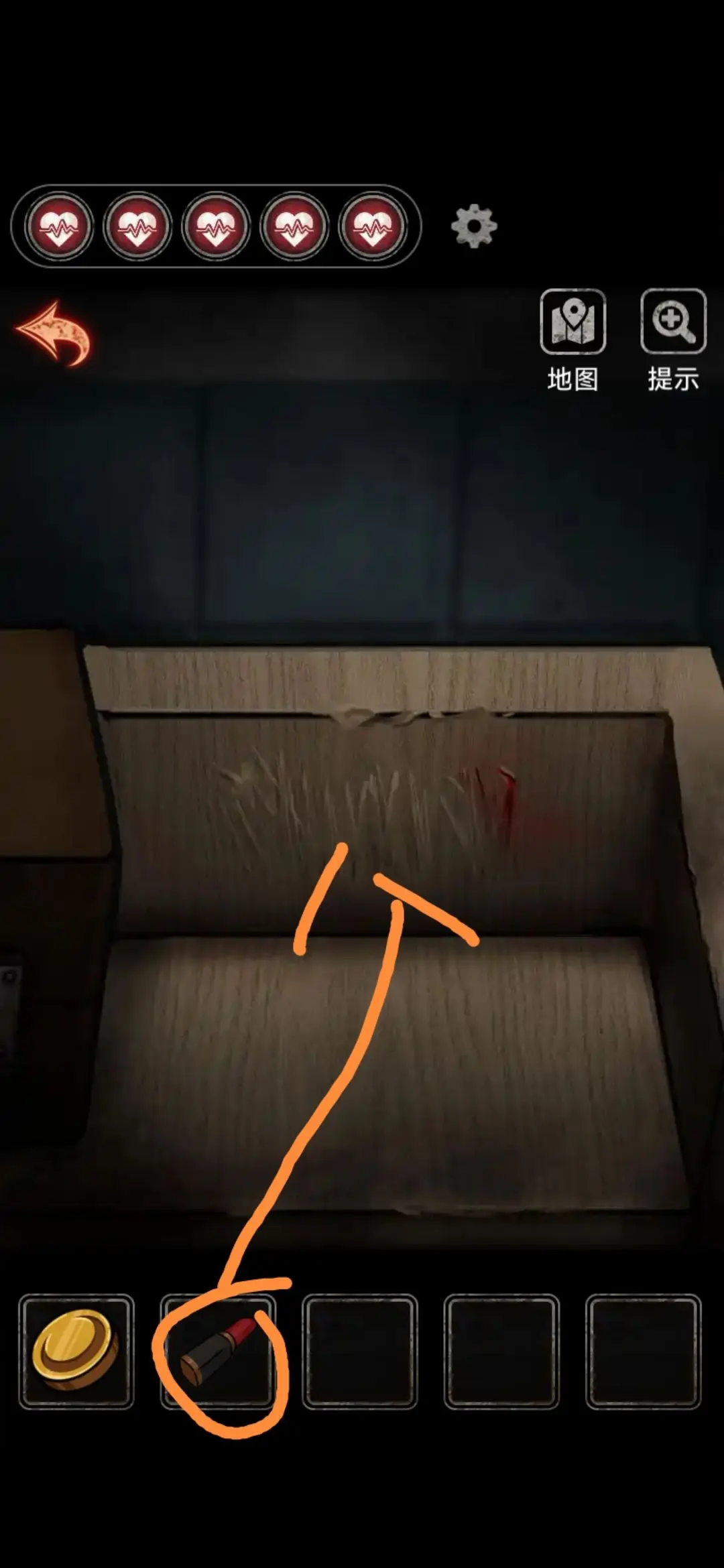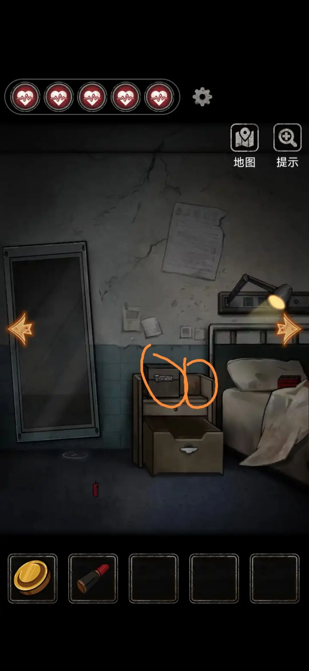 用口红涂抹床头柜上划痕得到密码VIII III IV,输入床头柜箱子得到钥匙