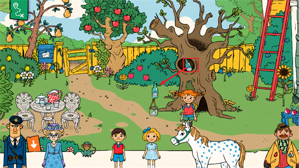 3、进入到选定的场景内之后,玩家可以点击场景内的物品,如点击树洞内的酒瓶,并将酒瓶放置在树下面;