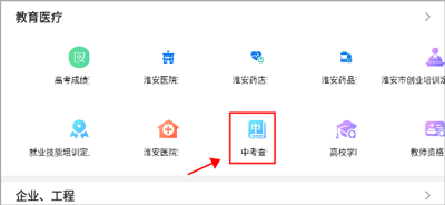 1、打开软件后,在服务界面,教育医疗下方点击“中考查询”