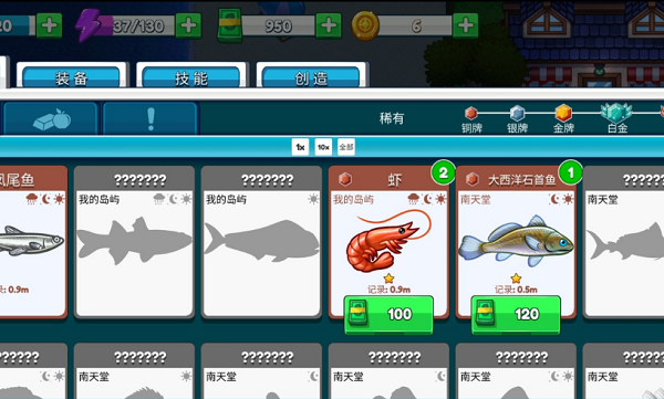 3、开放所有的海域资源,同时会不断的来更新自己的工具的等级,收集更多的鱼类。