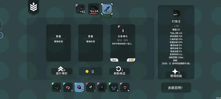 1、首先我们首先我们开局使用打铁王,开局清理掉两波怪,将初始武器升到10级,然后通过初始武器的特性(每升级一次商店,武器等级翻倍)一次将初始武器的等级拉高,在80级或160的时候就可以刷取我们的道具了,优先刷取生命恢复类(当然是保命最重要了),比如肺和呲牙咧嘴,都能在前期有效的给我们保驾护航。