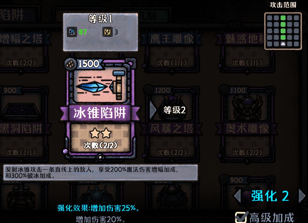 ●等级:等级越高,陷阱等级上限越高(需要在对局内点击陷阱消耗木材强化),可能的强化项包括:攻击力提升、攻击频率提升、消耗木材降低等等,受限于强化等级。