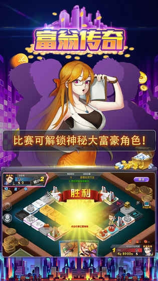 赚钱大比拼富翁传奇是一个轻松有趣的休闲 冒险游戏 ,游戏保留了传统大富翁的所有元素,并融合了"手牌组"玩法概念和角色和骰子养成的新形态手游!精致唯美的Q版美术画面,简单有趣的游戏玩法,实时多人在线 竞技pk 玩法.