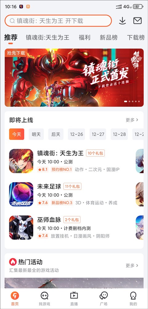 1、进入主界面可看到主要划分为首页、找游戏、直播、广场、我的这五大模板;