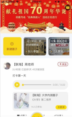 琅琅读经典是国学经典诵读为主的读书工具软件,通过个人或者机构建圈,邀请身边用户参与跟读、还具有打卡、评分、教学以及国学相关活动发布等功能,通过国学经典诵读构建起来的少儿童蒙国学教育精准化定制化教育平台。
