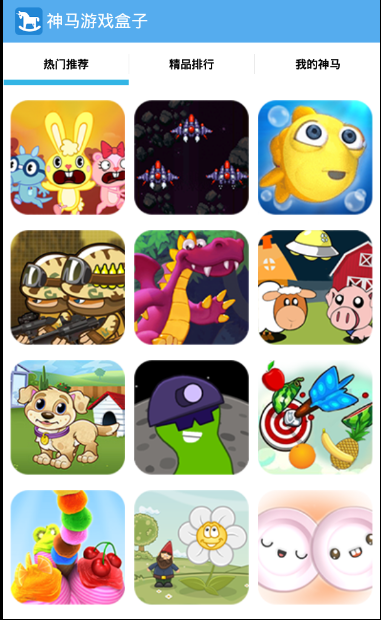1、在手机上安装好神马游戏盒子之后,打开应用,里面全部都是一些精品HTML5游戏,应用主要分为热门推荐、精品排行、我的神马三个部分