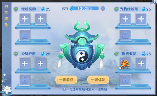 日程里有一个任务是丹鼎炼化,通过炼化可以收获不少的铜钱。只需要点一下炼化,再等上一段时间就可以收获铜钱了!等待的过程中,可以照常刷其他任务,真是又好又快又省事有木有!