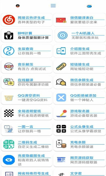 ashang工具箱app下载分享给大家,这是一款功能超级丰富手机魔盒,软件内有网易云热评生成、一个ai机器人、微信约生成等诸多有趣功能等你体验,欢迎感兴趣的用户下载体验!
