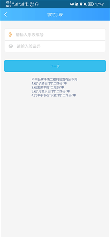 四、点击手动绑定,将手表编号,验证码填写后完成绑定就可以了(手表编码和验证码获取方法:手表中选择绑定二维码,单击显示出来的二维码就可以查看到)