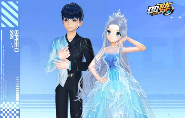 女生水波纹蓝色长裙,如水般荡漾,点缀华丽亮片,闪耀温润明媚的光芒;男生蓝黑色短发,穿着修身的蓝黑色西装,透露着高贵与稳重。