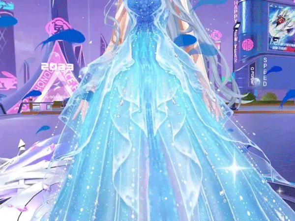 蓝色与金色不规则的裙摆,覆上层层轻纱,使得裙摆灵动飘逸,装饰着与长裙颜色相同的水晶挂饰,更显华丽。