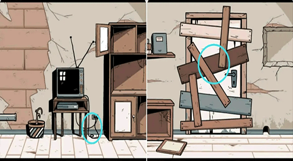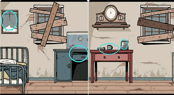 6、打开两个卧室门进行搜索,在左边卧室的抽屉里获得胶水,先记住墙上的画然后到右边卧室拿到桌子上的黄色笔记本,最后观察第四幅图并结合之前的图画提示打开取暖炉旁边的箱子获得灯泡。