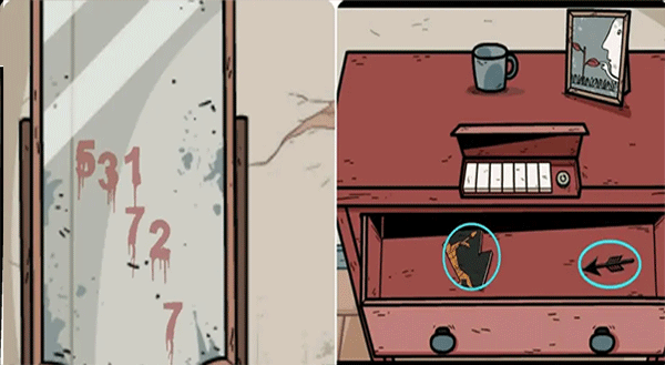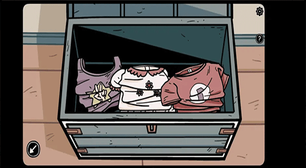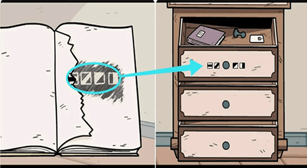 7、观察箱子里的衣服上的图案(右1左2中3)和衣领上的标签(三个符号),然后按顺序排列符号即可打开之前获得的黄色笔记本。