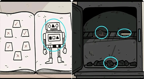 8、观察笔记本里的内容,根据机器人身上的提示(注意黑白位置,会有所变化,根据实际情况来)打开右边的取暖炉获得花瓶碎片、铅笔和煤炭。