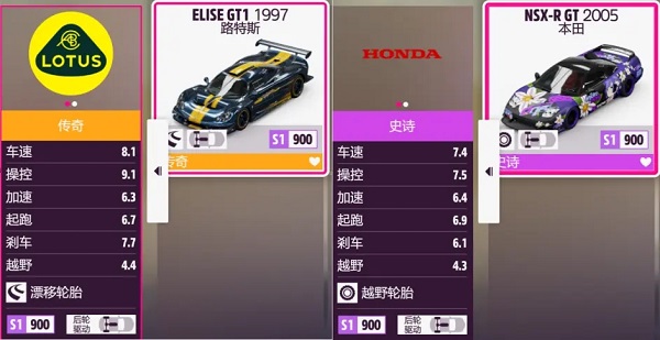 两台常见的s1级别公路车,本田火箭nsxr gt(右)作为大马力后驱车代表车速评分为7.4,而路特斯gt1(左)作为操控车代表,车速评分为8.1。