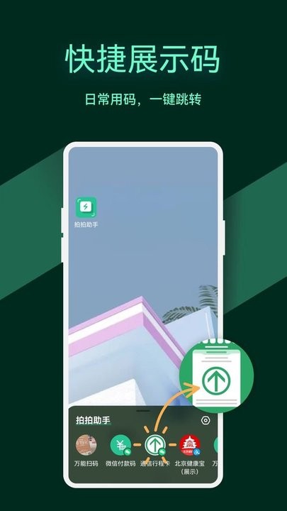 拍拍助手还集成了生活中大多数场景的展示码,如健康宝、付款码、公交地铁码、和个人名片码,使展示码的出示1秒完成,省去了寻找APP的烦恼。
