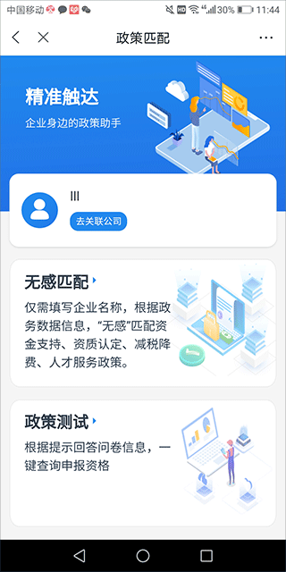 2、点击首页的政策匹配,可以对企业进行无感匹配资金支持、减税降费、人才服务等政策