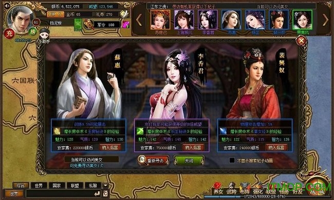 后宫是《皇帝传》独创的系统,历史上绝大多数美女都能在游戏中找到,不论是一代女皇武则天还是哭倒长城的孟姜女,亦或是青楼名妓苏小小、李师师,都将臣服在玩家的膝下。而传说中的四大美女则需要最强力的玩家才有资格占有。玩家获得的妃子都可以增强玩家的战斗属性,等级越高的美女增加的数值更高。妃子还具备不同的技能,放置于“桃花阵”中可以获得独特的被动加成,玩家在完成自己的征战霸业的时候有机会体验到各式各样的惊喜。正所谓美女不仅仅是花瓶,也可以是贤内助。