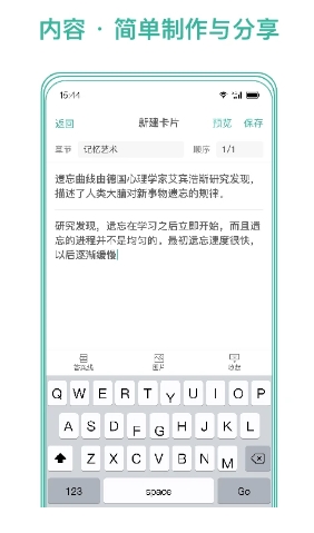 2,定制高效的抗遗忘策略,会为用户安排合适的时间进行复习,记忆规划,加入了知识卡,通过名下的原创牌主,用户学习一张卡片消耗多少马克由自己设置。