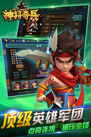《神将奇兵》是一款以三国为题材的军团 策略手游 ,致力于为玩家打造最真实的战争体验。创新3x5战阵,百余名三国猛将、千余种阵容搭配,打破传统卡牌的无脑战斗。游戏以武将的收集养成为核心,包含了宝物争夺、武将列传、玩家竞技等数十种玩法。更有气势恢宏的大型国战,群雄逐鹿让主公一战成名。