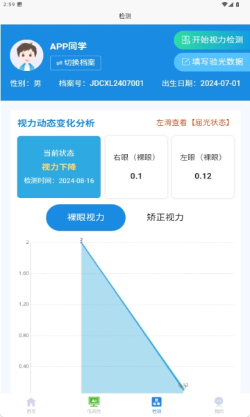 5、视力动态变化分析:软件能够通过视力检测和视光数据的完善,分析视力动态数据变化、屈光动态变化、眼轴长度动态变化情况,形成近视防控和眼健康AI管理动态生物模型。及时采取预防和保护措施。