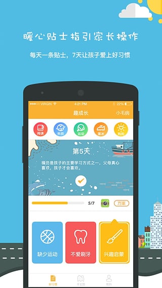 新增 :增加症状模块,家长可以根据孩子存在的问题选择相应症状,系统会推送相应的习惯培养方案,帮助家长更好地指导孩子