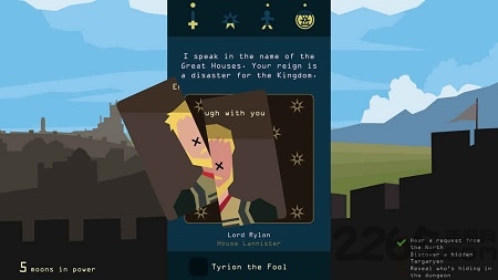 面对着维斯特洛人民热情激昂的请愿和变幻莫测的需求,七王国的命运走向就取决于玩家轻松滑动的卡牌之后。假如某个角色让你太过烦心,那就撕了他的卡片,让他不再影响你的王权——但代价又如何呢?