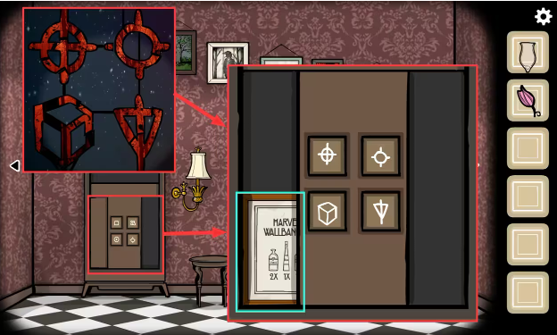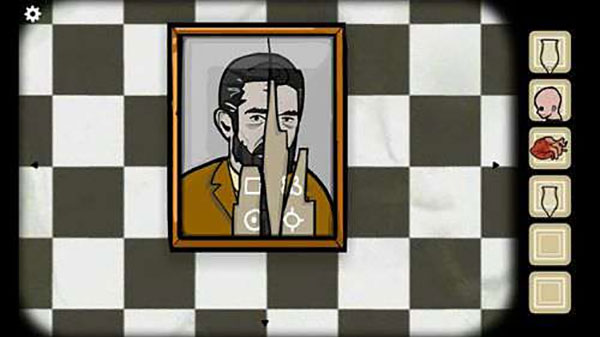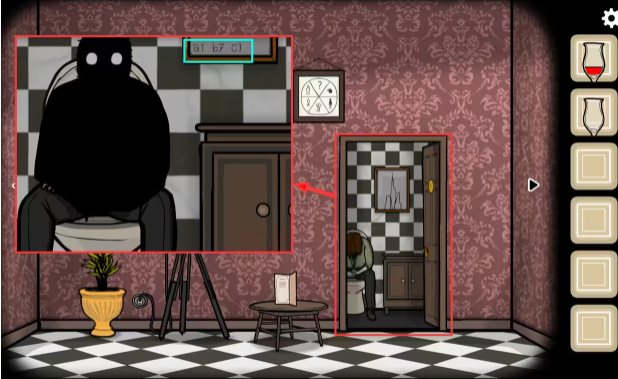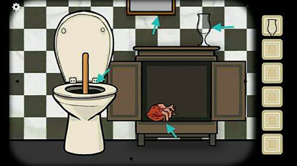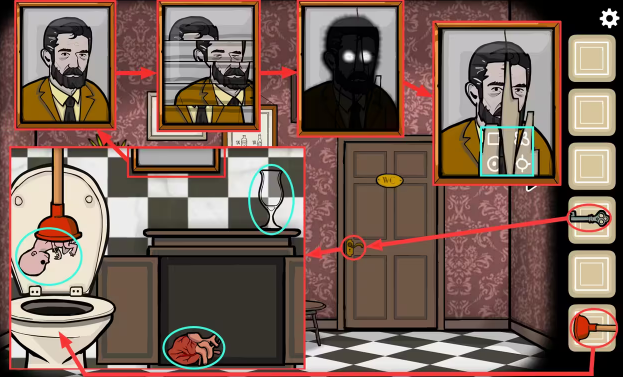厕所视角:用(钥匙)打开厕所;在厕所柜子上获得(鸡尾酒杯),打开柜门获得(心脏),用(皮搋子)疏通马桶,吸上来一个(胚胎),点击获得;点击镜子,镜子里的戴尔分成了五个部分,移动每个部分将戴尔拼成原来的样子,拼完的一瞬间镜子里闪过一个小黑弄碎了镜子,点击碎掉的镜子,在镜子下获得四个符号。