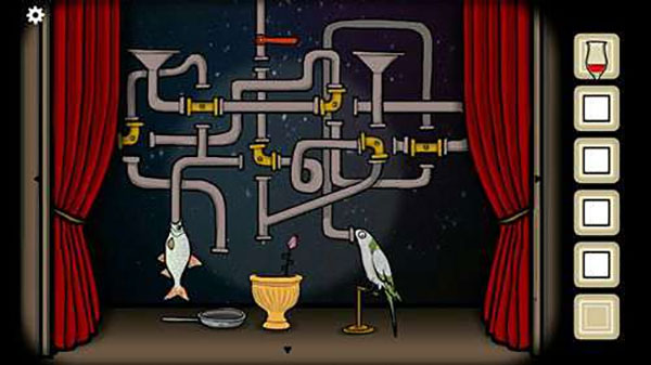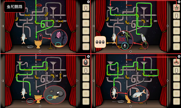 舞台视角:点击舞台幕布,《鱼和鹦鹉》开始;将(花)栽种到花盆里,把管道按图一的路线连通,打开开关让水流入花盆,花吸收水后掉出了一些(鸟食);把管道按图二的路线连通,将(鸟食)放入左侧的漏斗中喂给鹦鹉哈维,哈维吃完后下出一颗(黑蛋),把(黑蛋)放入左侧的漏斗喂给哈维,哈维会再次下出一颗(黑蛋),喂给哈维一次鸟食和两次黑蛋后在得到第三颗(黑蛋)时获得成就(煎蛋);把管道按图三的路线连通,将(黑蛋)放入左侧的漏斗中,蛋掉到平底锅里摔碎了,获得(虫子);把管道按图四的路线连通,将(虫子)放入右侧的漏斗喂给鱼,鱼缓缓飘起离开了界面;节目结束。(如果物品放置错误的话可以在之前得到的地方重新获得,黑蛋甚至能在管道断开的末端获得)