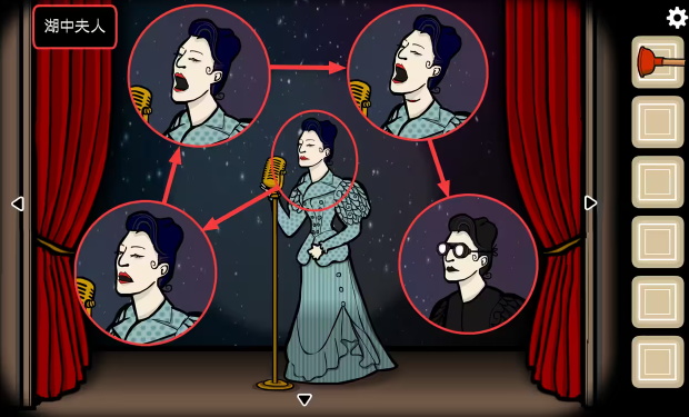 舞台视角:点击舞台幕布,《湖中夫人》开始;点击话筒前的蓝衣女士,她唱歌的声调越来越高,头仰得也越来越高,最后喉咙处撕开了一个口子,蓝衣女士倒在了地上,同时分出了一个似乎代表灵魂的黑衣女士。