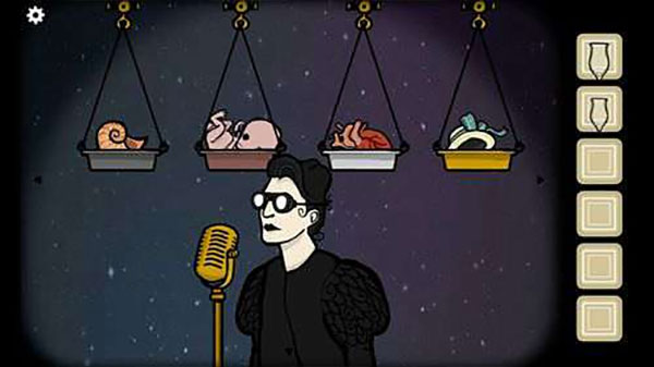 舞台视角:连续点击黑衣女士,将(贝壳)、(胚胎)、(心脏)和(帽子)从左到右放置到天平上(帽子一开始就放在第一个天平上),黑衣女士的嘴里射出一道光线后长出一朵(花),点击获得;节目结束。