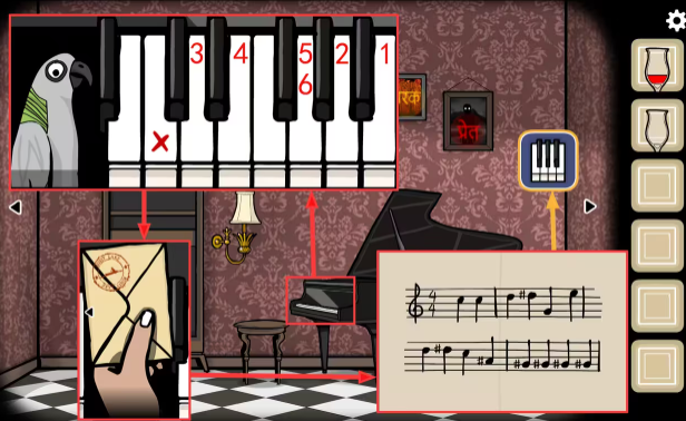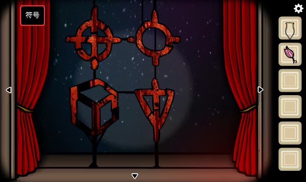 钢琴视角:点击柜子下侧,将刚从舞台上获得的符号按对应位置输入,获得一份配方;节目结束。