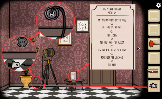 厕所视角:点击聚光灯的插座,用(螺丝刀)将(插头)和电线连接后插到插座上,聚光灯亮起来打到了舞台上;点击小桌子上的节目单,内容如图。