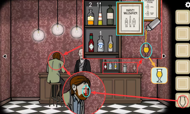 1、与调酒师对话,根据酒柜旁边的提示「2×VODKA、2×JUICE」调一杯酒,将酒递给旁边的男人,喝下酒后多次点击男人的嘴获得「螺丝刀」。