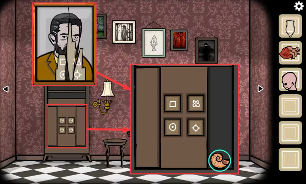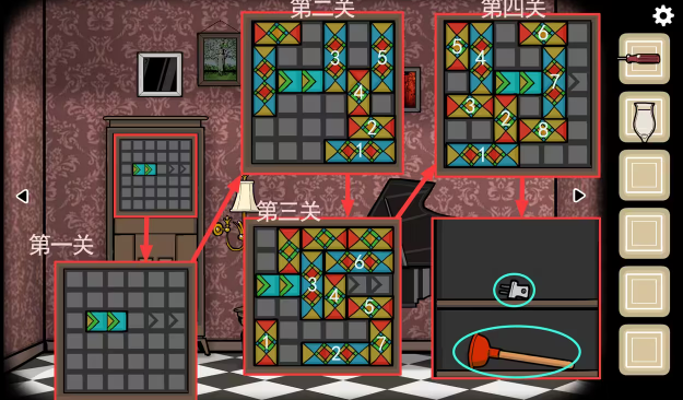 6、点击镜子,完成拼图后获得提示,退出点击钢琴旁边的柜子,输入图案打开右边的暗格获得「海螺」。