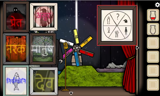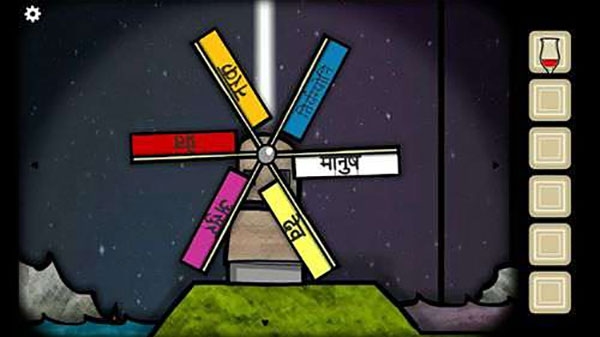 舞台视角:六场表演都开始后,舞台上的灯打到了钢琴视角墙上的六幅画上,显示出了不一样的梵文;根据厕所视角墙上的提示,将磨坊的风车扇叶排列成如图的样子,磨坊顶端射出了一道光线。